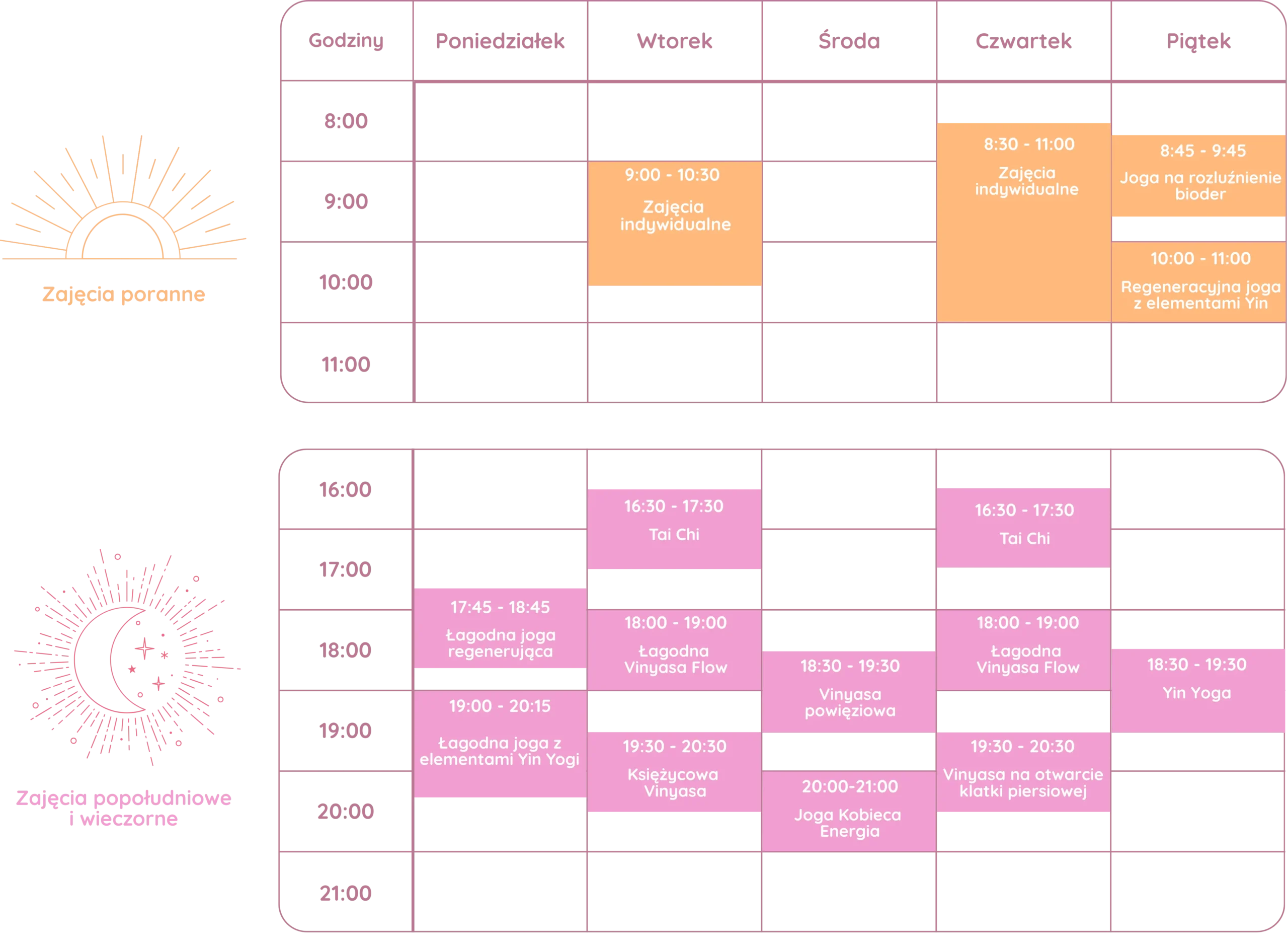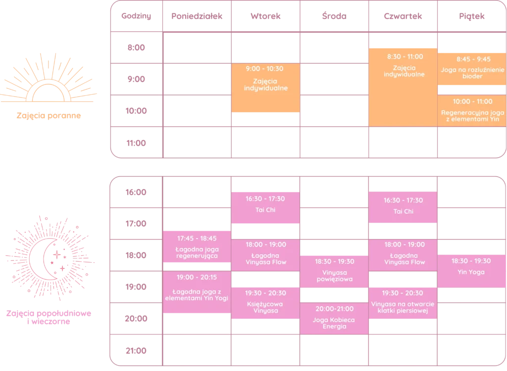 Jeśli dopiero zaczynasz swoją przygodę z jogą – najłagodniej wprowadzą Cię zajęcia takie jak Łagodna Joga Regenerująca, Łagodna Vinyasa Flow lub Yin Joga.